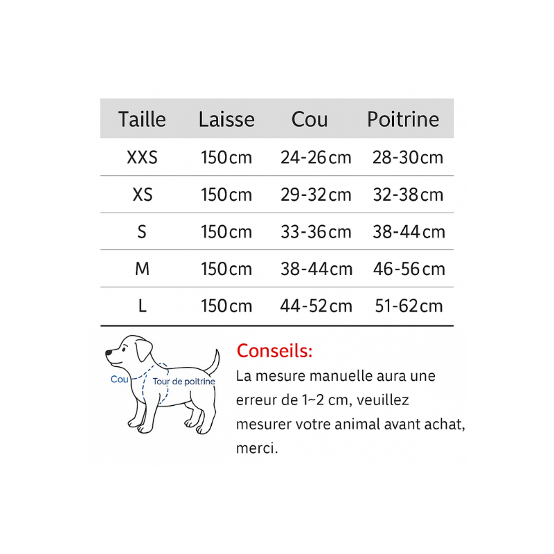 Si votre chien se situe entre deux tailles, nous vous recommandons de choisir la taille au-dessus pour plus de confort