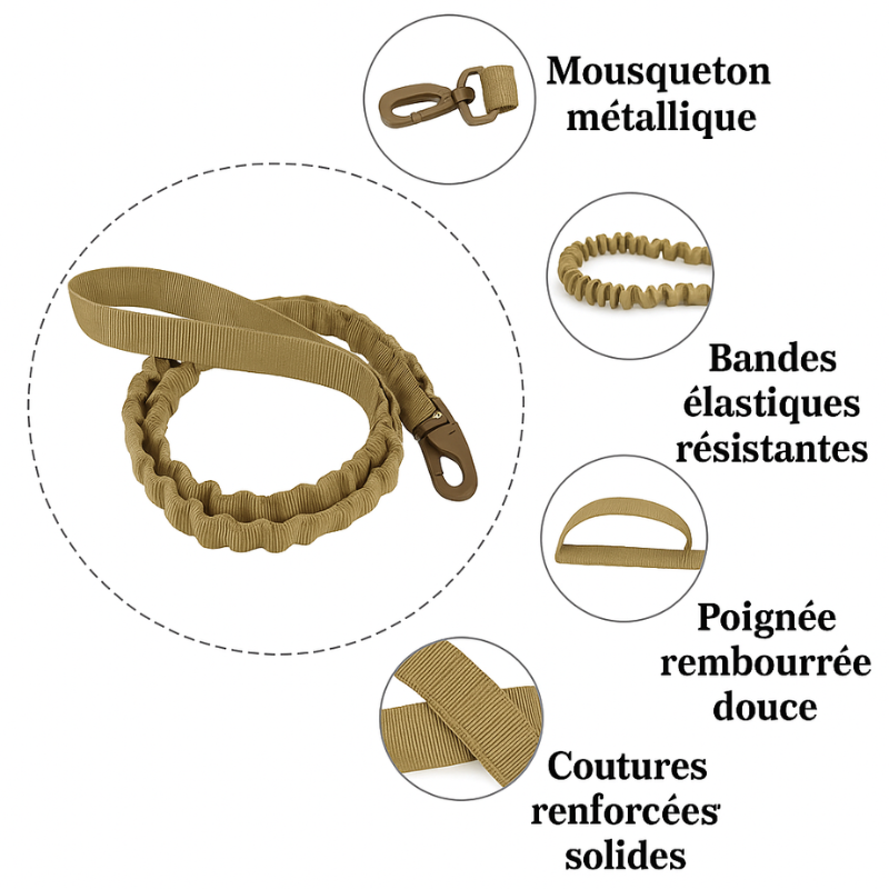 Le pack comprend une longe résistante, idéale pour accompagner le harnais tactique. Elle est équipée d’un mousqueton métallique robuste et d’une poignée rembourrée pour un contrôle ferme et confortable, même lors de tractions soudaines. Profitez en toute sécurité de votre chien !