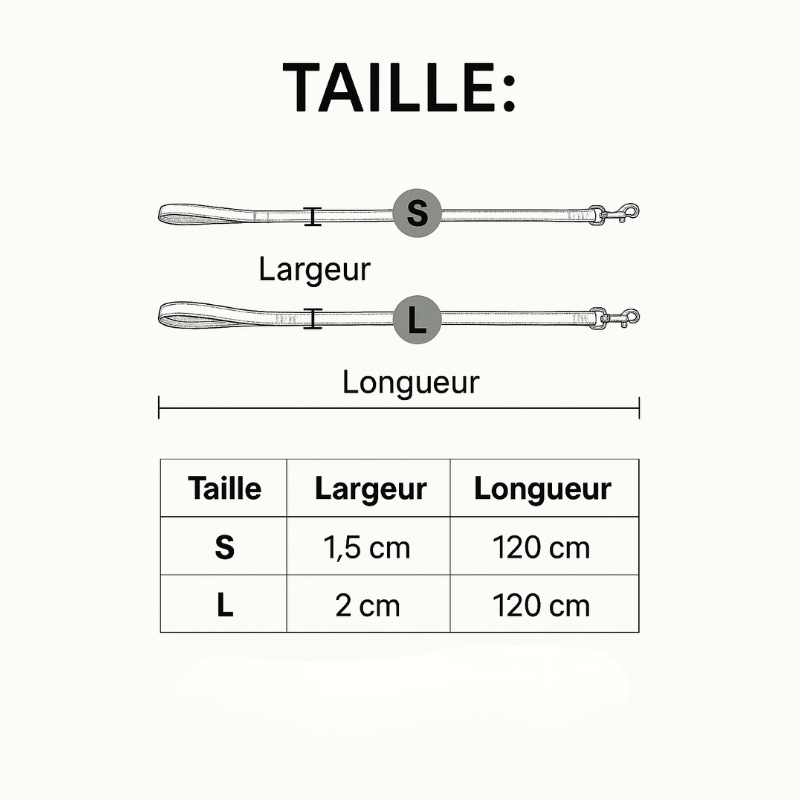 Pour garantir un confort optimal, il est essentiel de bien choisir la taille de votre laisse en cuir, pour une meilleur poigne. Munissez vous d’un mètre ruban et mesurez pour vous ce qui est le mieux pour vos longue balade !