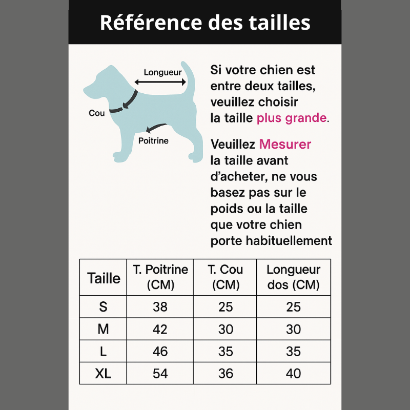 Si votre chien se situe entre deux tailles, nous vous recommandons de choisir la taille au-dessus pour plus de confort.