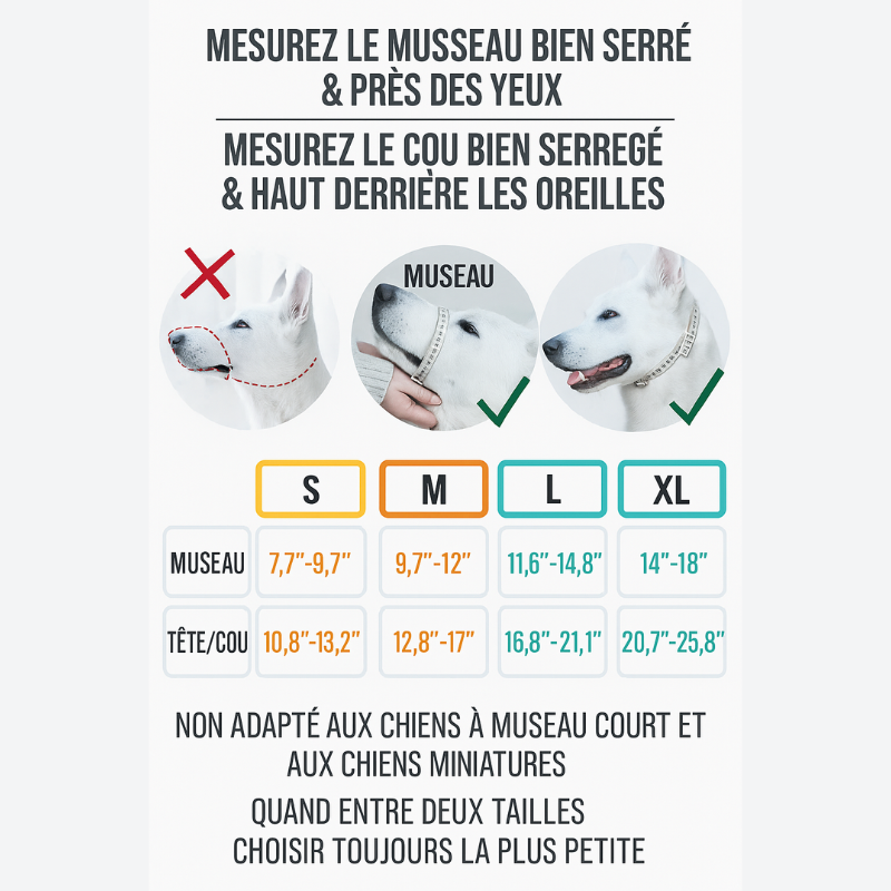 Pour garantir un confort optimal, il est essentiel de bien choisir la taille de la muselière. Munissez vous d’un mètre ruban et mesurez :
